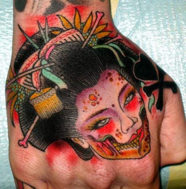 手背亚洲风格的彩色怪物艺伎纹身图案