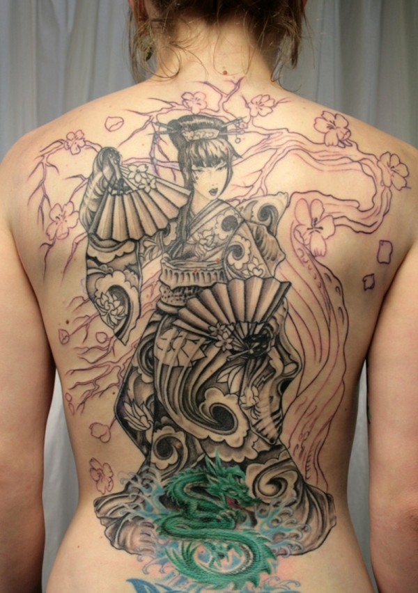 满背漂亮的和服艺妓和龙纹身图案
