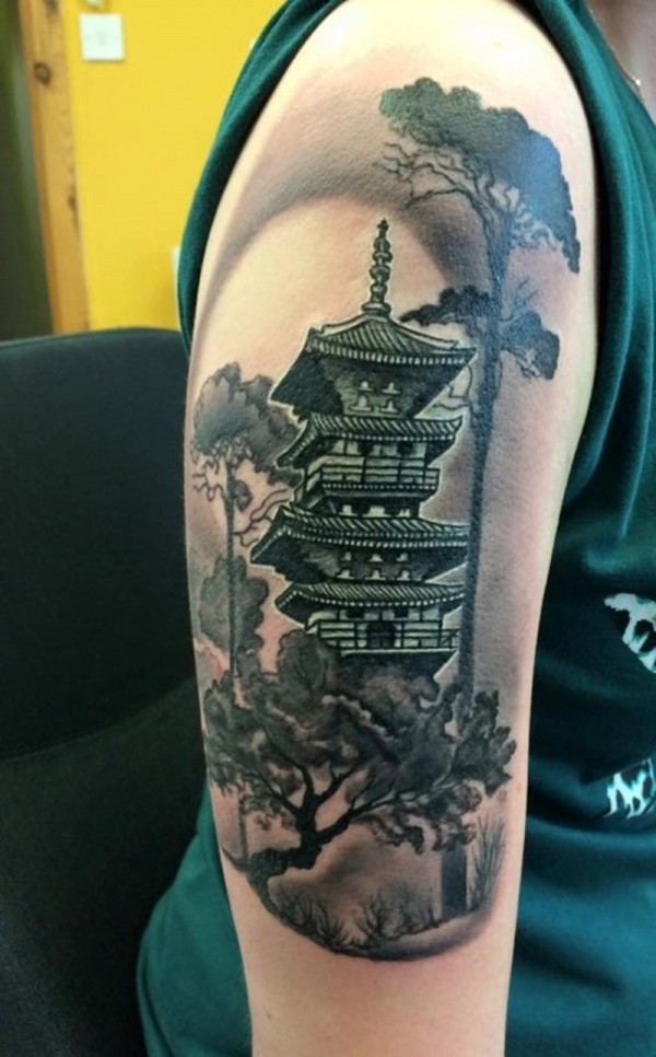 大臂天然外观的亚洲房子与大树纹身图案