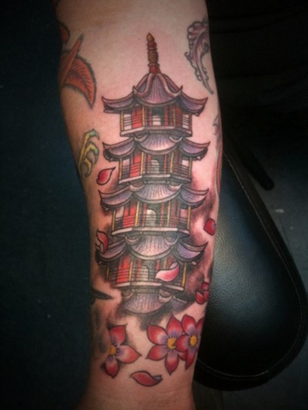 小臂漂亮的彩色亚洲寺庙与鲜花纹身图案