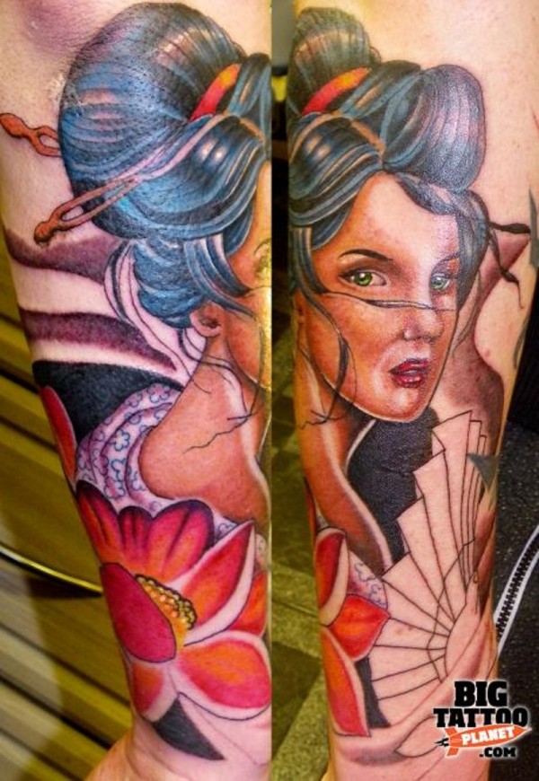 手臂亚洲的传统风格彩绘艺妓和莲花纹身图案