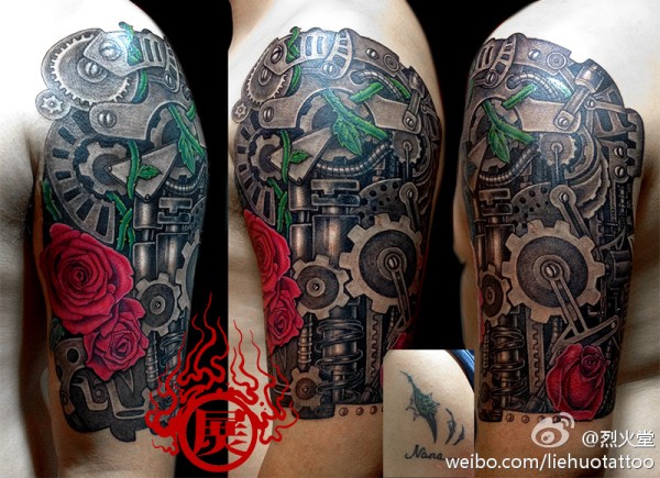 玫瑰花缠绕机械的纹身图案,客人喜欢机械,还想带些花卉