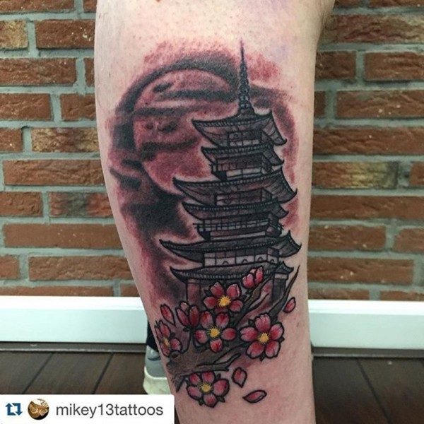 小腿彩色的亚洲寺庙与盛开的花朵纹身图案