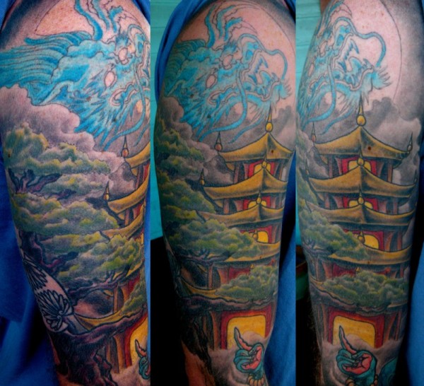 大臂亚洲风格多彩的蓝色龙纹身图案