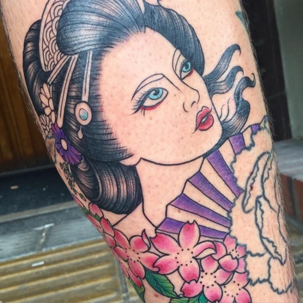 小腿复古风格的五彩亚洲艺妓和花蕊纹身图案