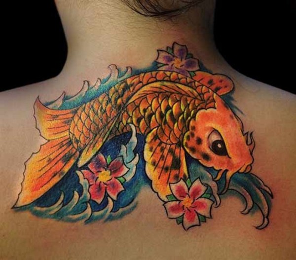 亚洲式的金色鲤鱼和波浪花卉背部纹身图案