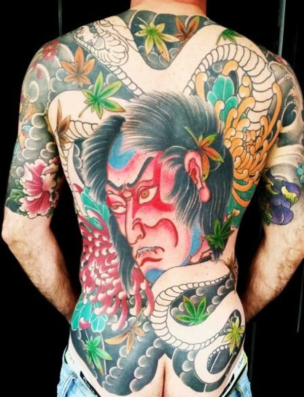 满背巨大的old school蛇菊花生首彩色纹身图案
