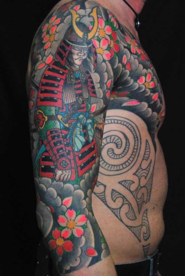 手臂和胸部亚洲风格彩色武士花朵纹身图案
