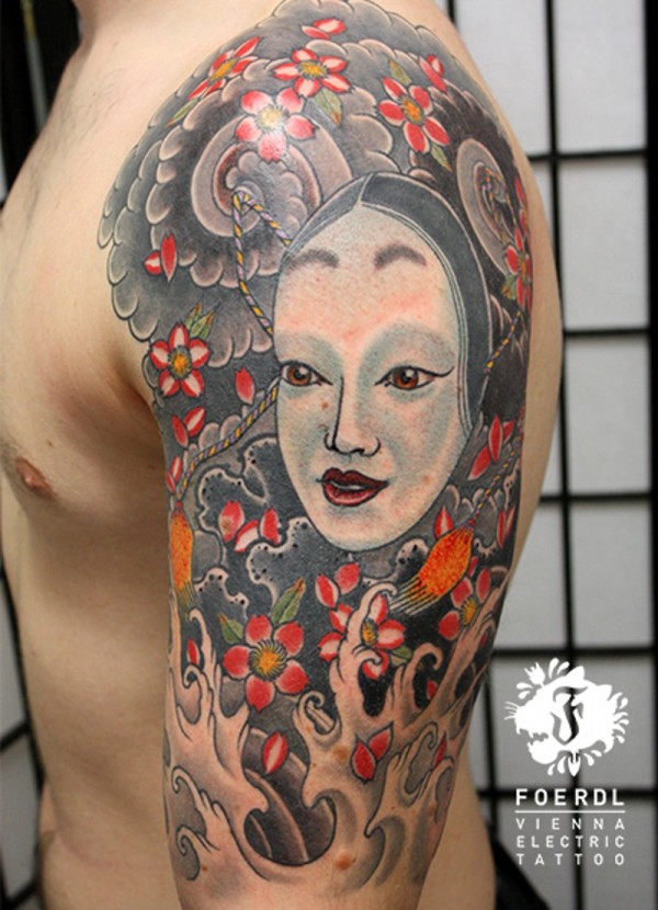大臂卡通风格的五彩女人面具花朵纹身图案