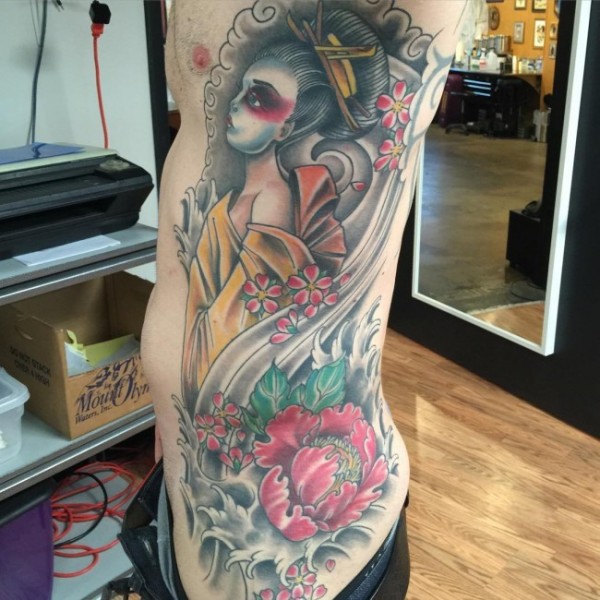 侧肋old school五彩的亚洲女人花朵纹身图案