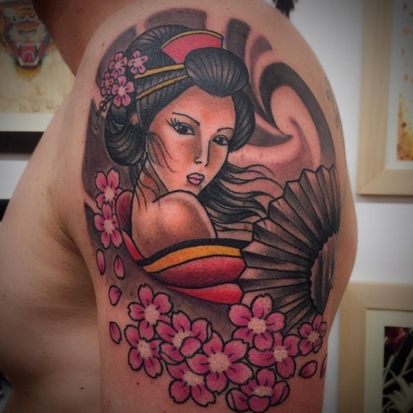 大臂迷人的性感亚洲艺妓和樱花纹身图案