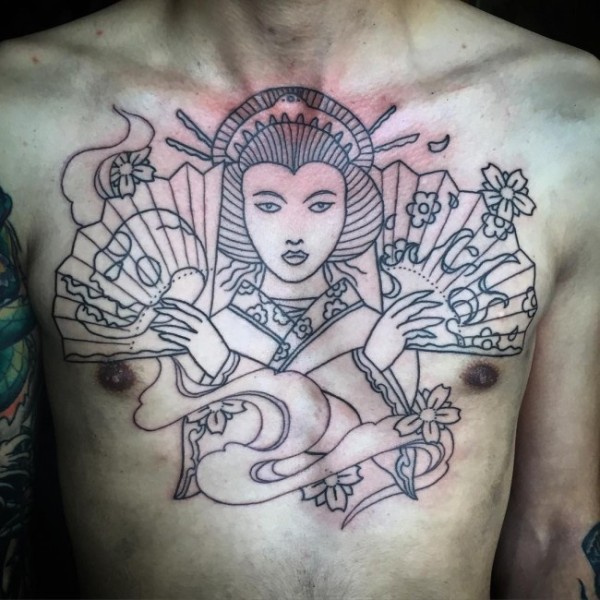 男性胸部亚洲风格的黑色艺妓扇子纹身图案