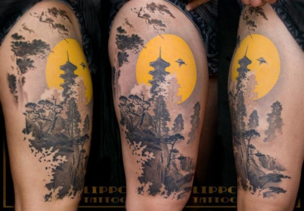 大臂油画般的亚洲山脉树林寺庙纹身图案