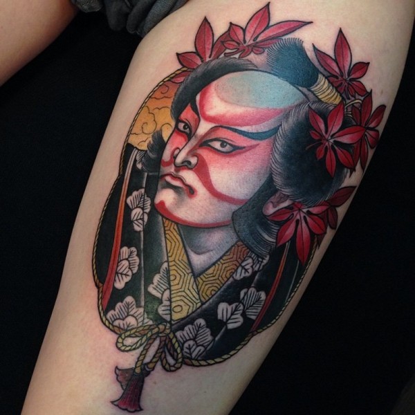 大腿彩色的亚洲男子肖像与枫叶纹身图案
