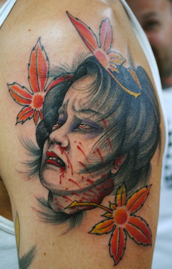 大臂令人毛骨悚然的血淋淋生首与树叶纹身图案