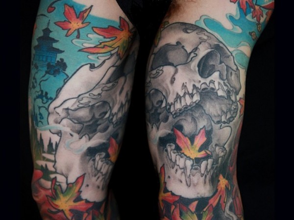 大臂幻想人类骷髅枫叶和寺庙纹身图案