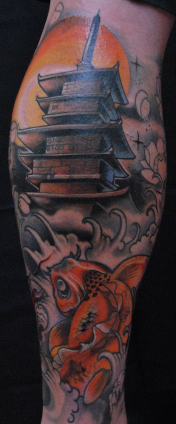 小腿漫画风格彩色的寺庙与鲤鱼纹身图案