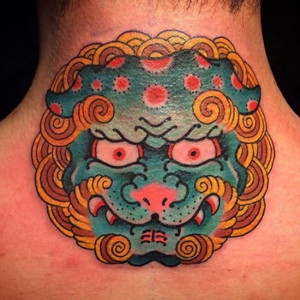 颈部亚洲风格的彩色唐狮头像纹身图案