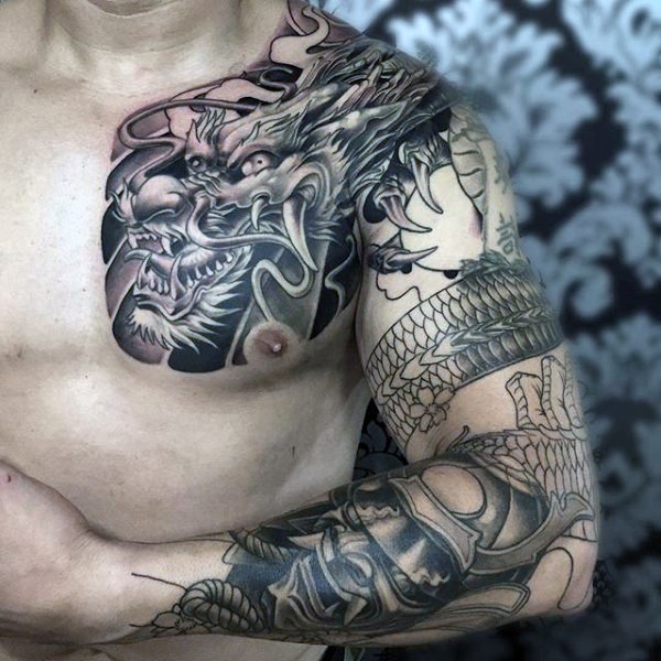 胸部和手臂大规模的彩色龙与武士面具纹身图案