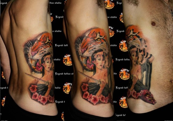 侧肋中等大小的亚洲女性老虎花朵纹身图案