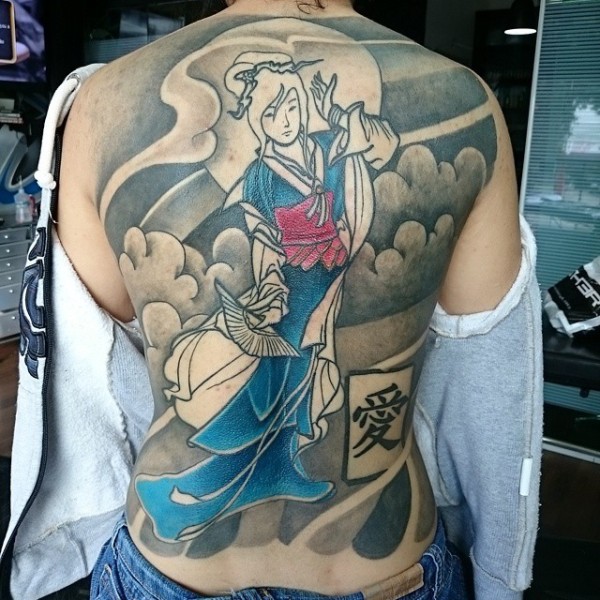 old school亚洲艺妓舞蹈和汉字满背纹身图案