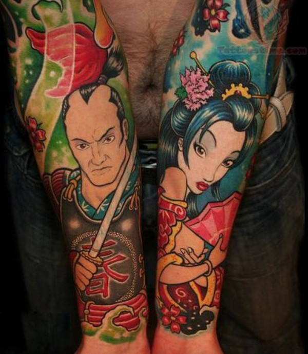 手背梦幻卡通风格的彩色武士和艺妓纹身图案