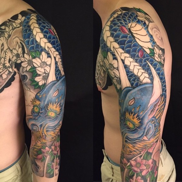 手臂亚洲风格的五彩龙和花蕊纹身图案