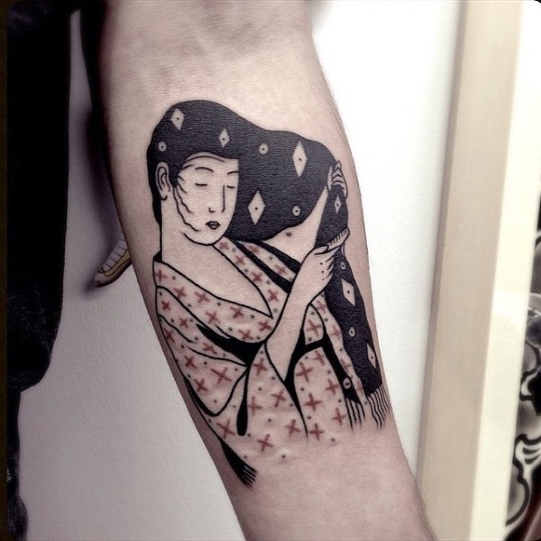 艺妓梳理她的头发彩绘小臂纹身图案