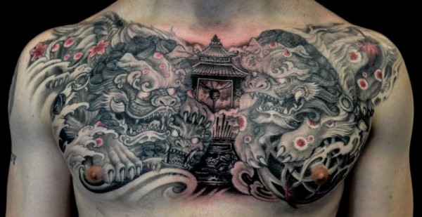 胸部亚洲主题的五彩老虎和神秘祭坛纹身图案