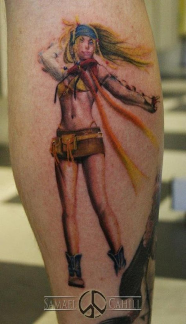 小腿令人印象深刻的卡通幻想女子纹身图案