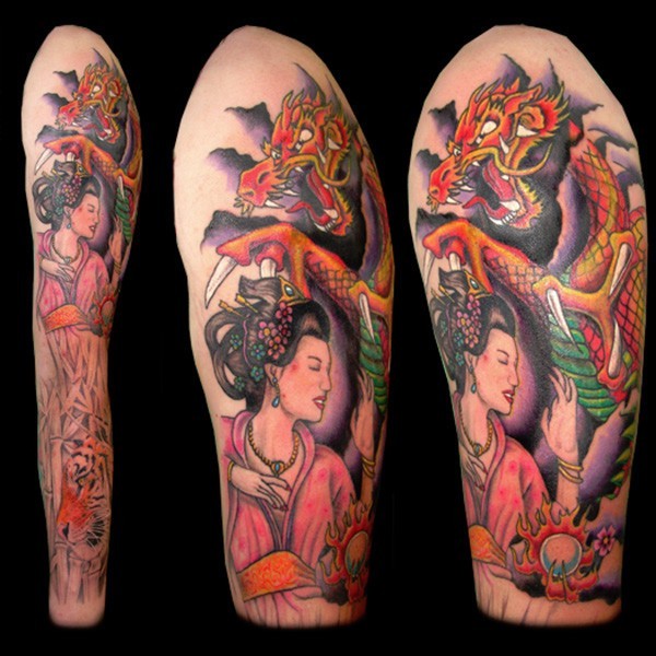 手臂old schoo丰富多彩的亚洲艺妓和龙纹身图案