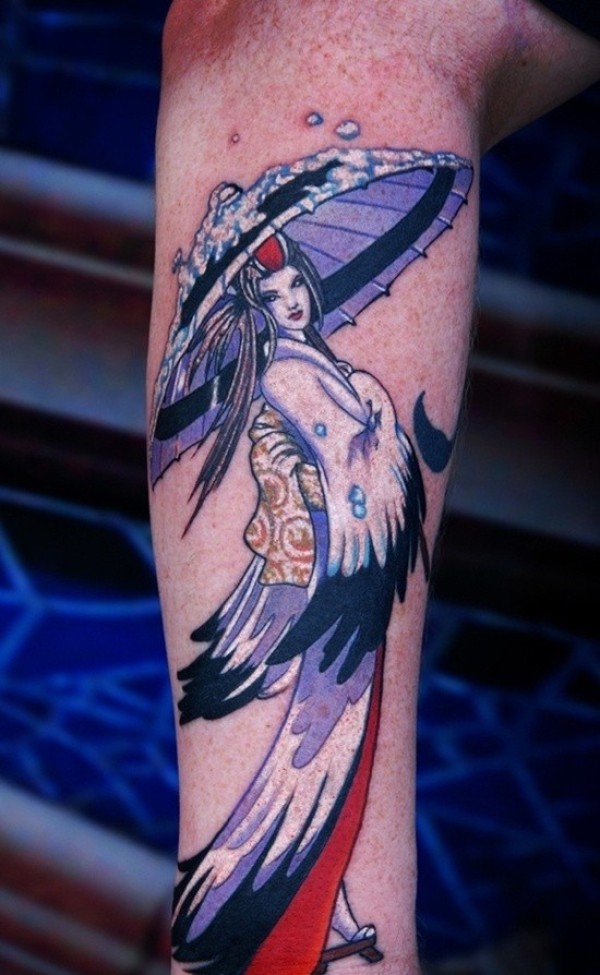 手臂亚洲卡通风格彩色艺妓和伞纹身图案