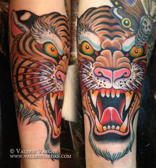 手臂亚洲卡通风格的彩色咆哮老虎蝴蝶纹身图案