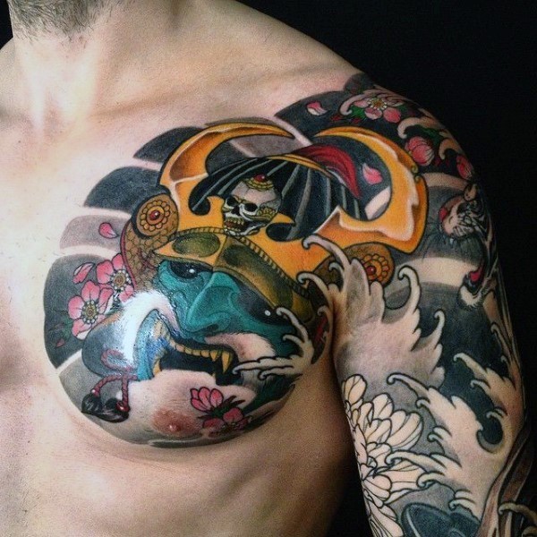 半甲卡通风格的彩色亚洲战士头盔纹身图案