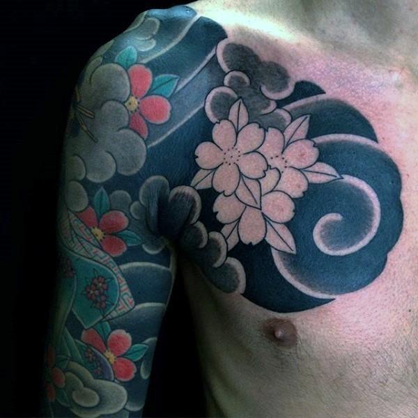 亚洲风格的彩色花朵半甲纹身图案