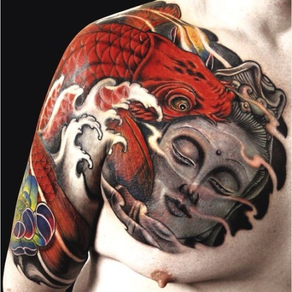 半甲亚洲风格的彩色鲤鱼与如来佛祖纹身图案