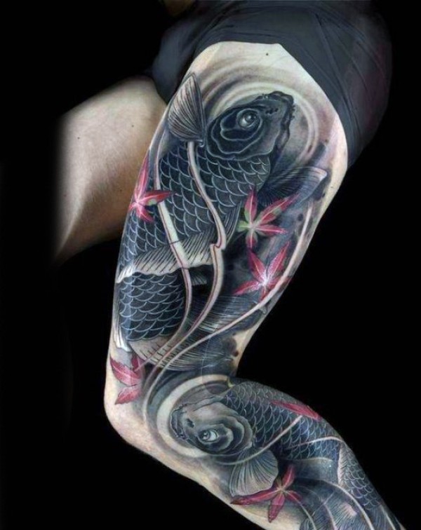 腿部亚洲风格的鲤鱼和叶子纹身图案