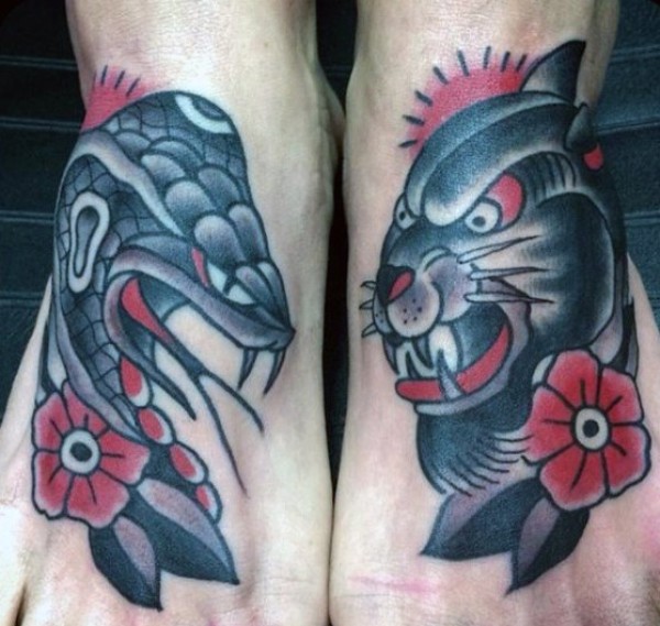 脚背亚洲风格的邪恶蛇和狮子纹身图案