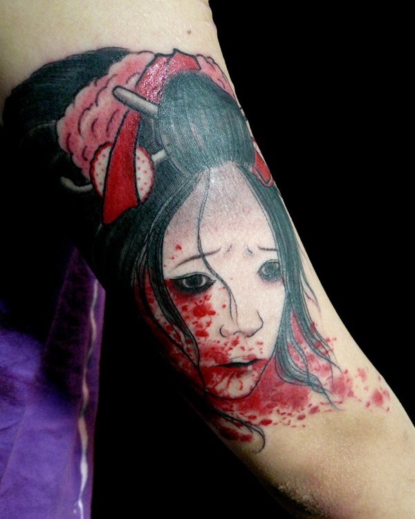 大臂恐怖的血腥艺妓生首彩绘纹身图案
