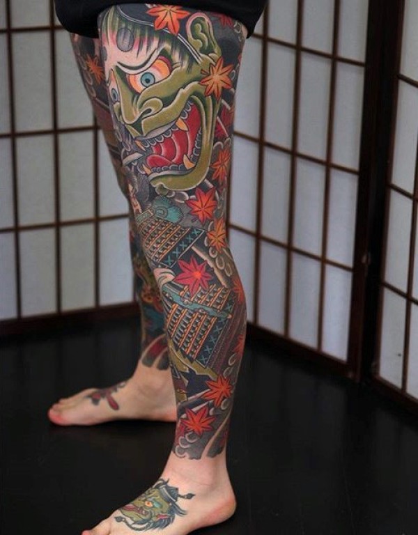 腿部亚洲风格的彩色恶魔面具和武士纹身图案