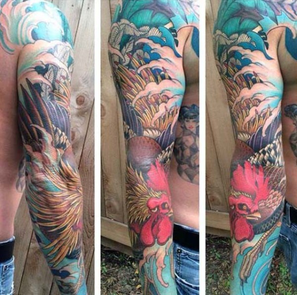 花臂亚洲风格设计的五彩大公鸡纹身图案