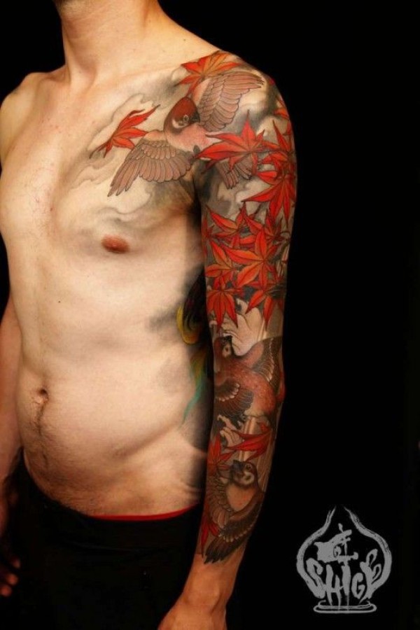 手臂亚洲风格逼真的鸟与枫叶纹身图案