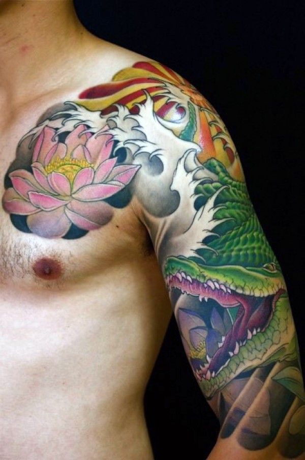 手臂亚洲风格五彩鳄鱼莲花纹身图案