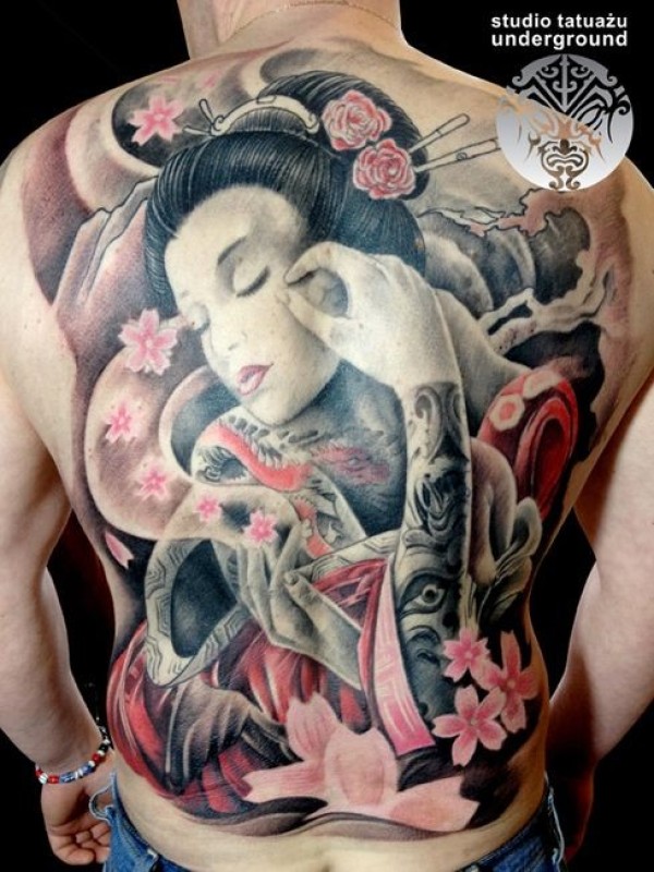 背部惊人的五彩艺妓和花朵纹身图案
