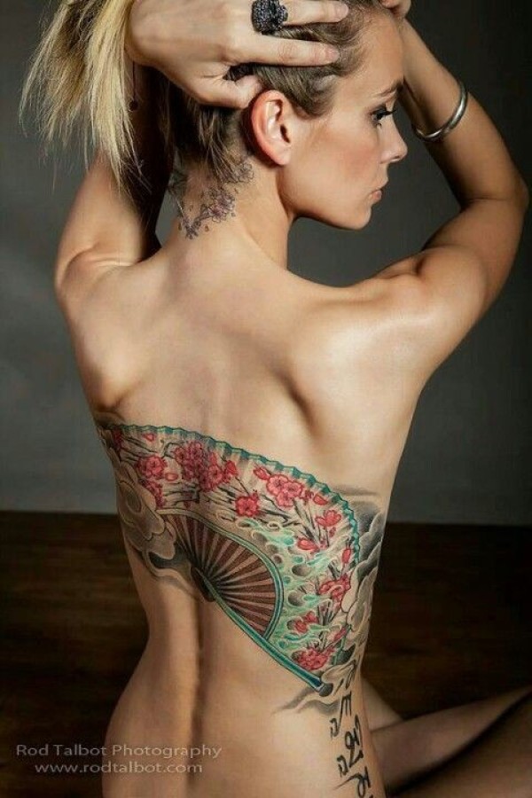 亚洲风格的大扇子彩色背部纹身图案