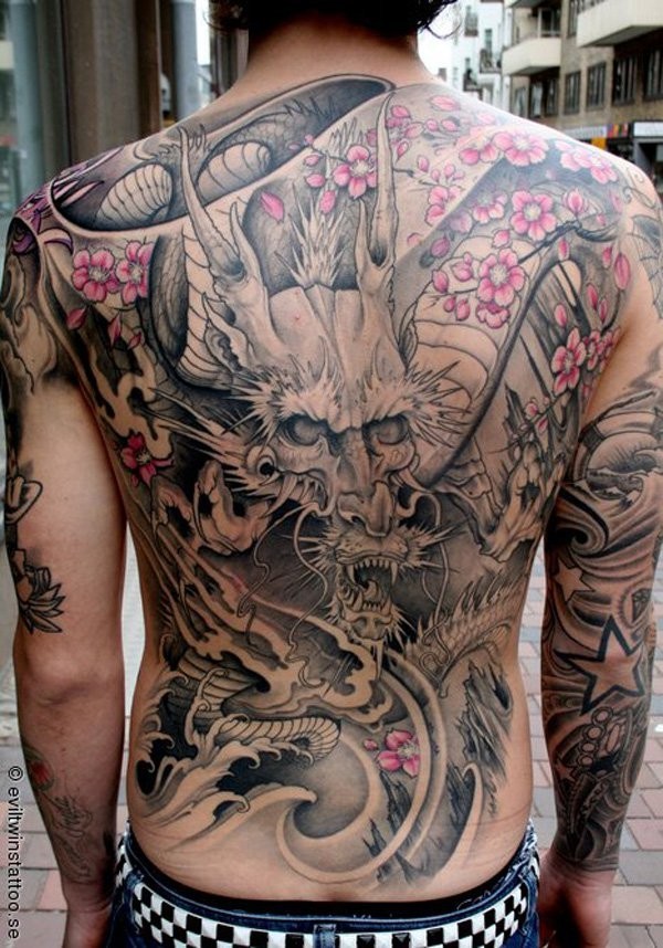 满背惊人的大规模半彩色亚洲龙花朵纹身图案