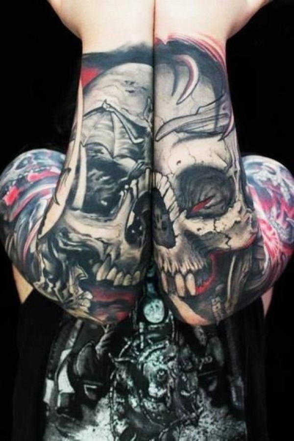 手臂亚洲风格的五彩怪物骷髅纹身图案