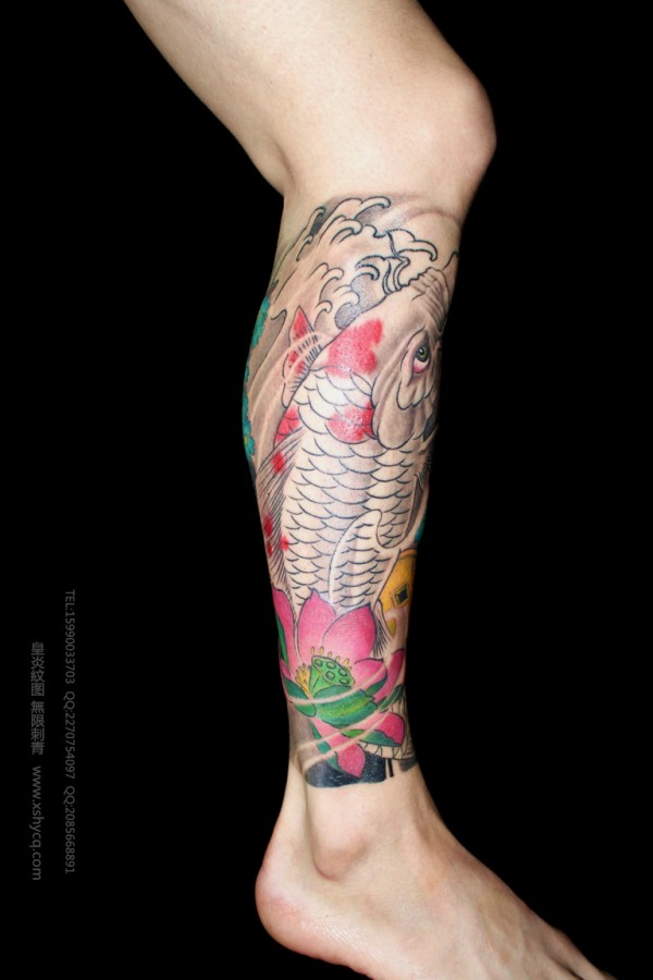 传统鲤鱼花小腿纹身_腿部纹身图案大全_纹身图吧