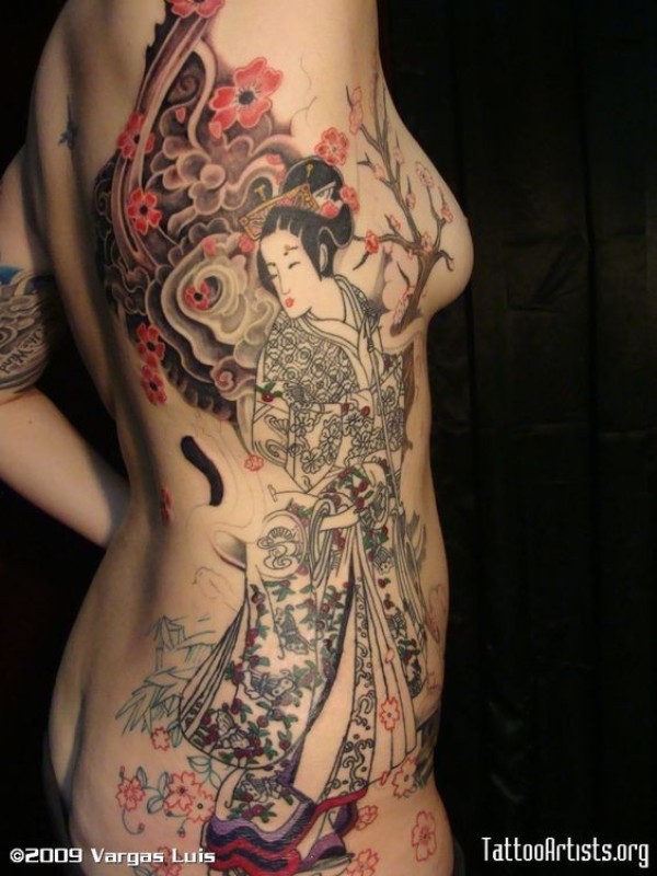 亚洲风格的五彩花朵艺妓侧肋纹身图案