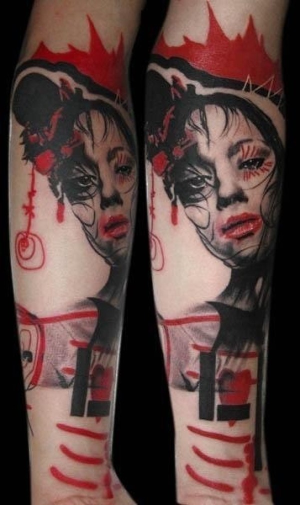 小腿不寻常的五彩亚洲女人肖像纹身图案